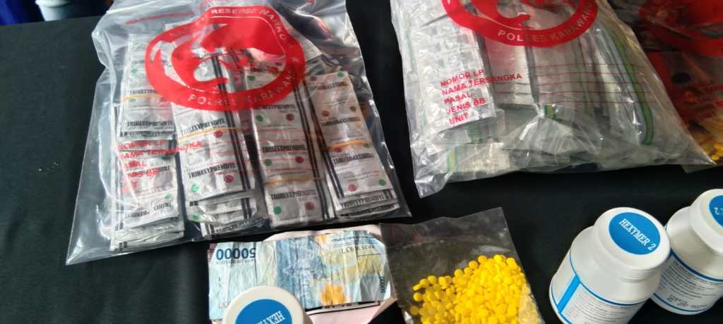 Sementara 3 tersangka pengedaran OKT, dengan inisial, MR, RH, dan I. Semua berasal dari Kab Karawang,